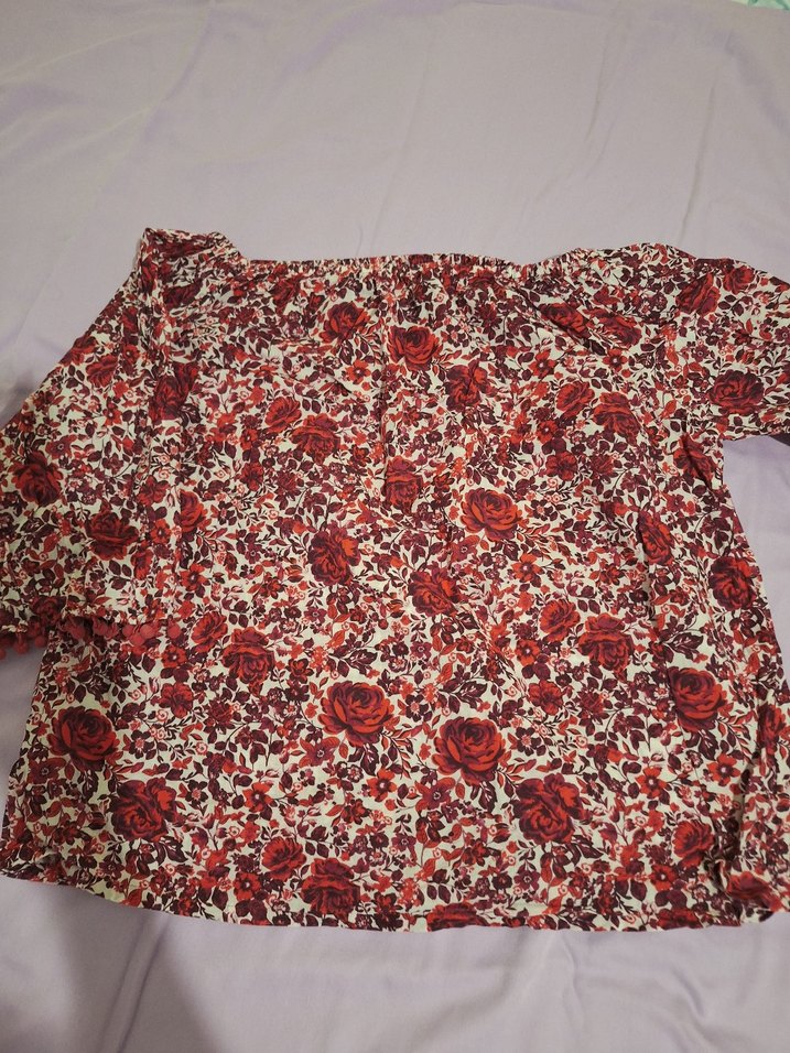 Bordo renkli, kısa kollu, kayık yaka bohem bluz. Çiçek desenli ve fırfırlı tasarıma sahip, rahat kalıplı, yumuşak sentetik kumaş.