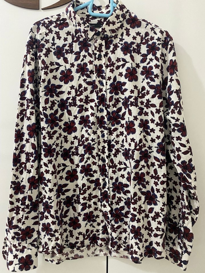 Pamuk kumaştan, uzun kollu, düğmeli ve yakalı olan bu bordo çiçek desenli gömlek, bol kesimi ve bohem vintage tarzıyla dikkat çekiyor. Ürün bir kez kullanılmıştır, hiçbir deformesi yoktur. M bedendir. %100 pamuktur. Kırışan bir kumaş değildir. İki kol arası 53 cm, ürün boyu 72 cm, kol boyu 63 cm.