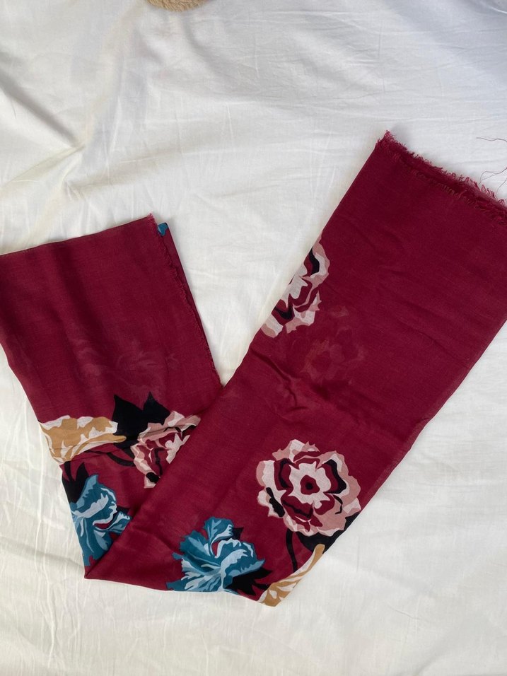 Bordo renkte, çiçek desenli, bohem tarzda, pamuk kumaştan yapılmış ve drapeli kadın şalı.