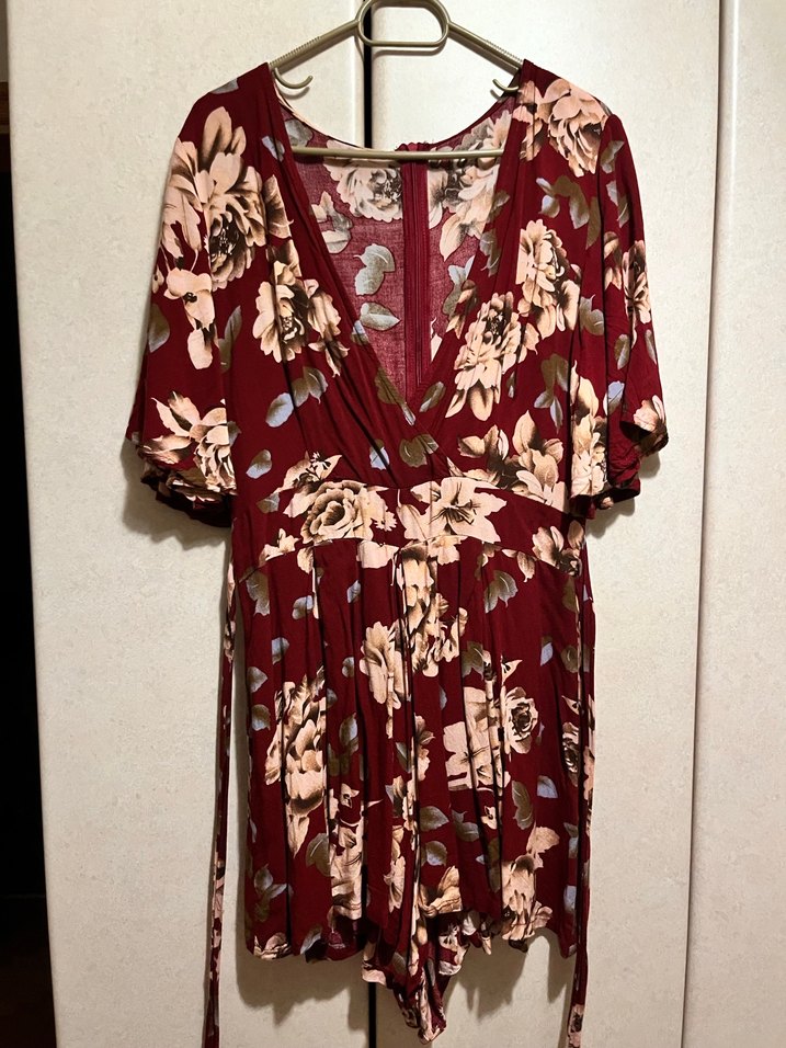 Bordo renkte, çiçek desenli, V yakalı ve dökümlü tasarımlı bol kesim tulum. Kısa kollu, yumuşak sentetik kumaştan, romantik akşamlar için uygun.