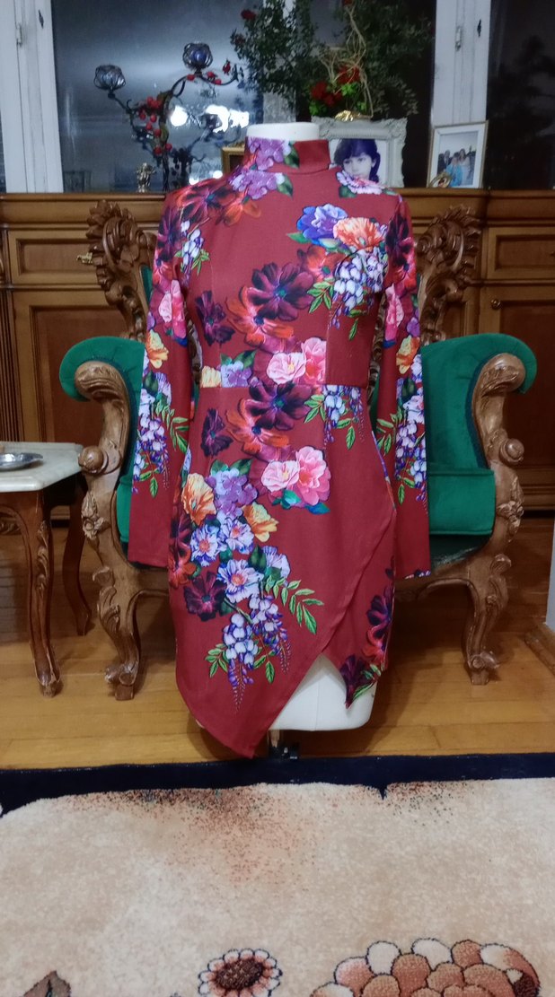 Bordo renkte, hakim yakalı ve uzun kollu, çiçek desenli, sentetik kumaştan yapılmış, bohem tarzda, vücuda oturan ve drapeli elbise.