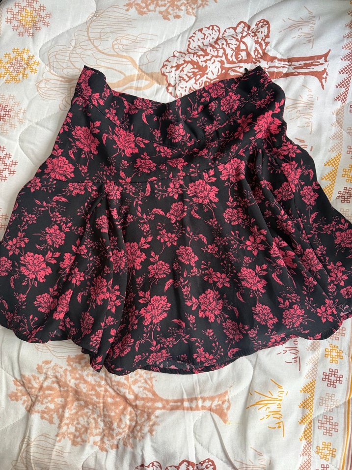 Bordo renkli, çiçek desenli ve fırfırlı detaylara sahip midi uzunlukta, bol kesim vintage goth ve bohem tarzını yansıtan etek.