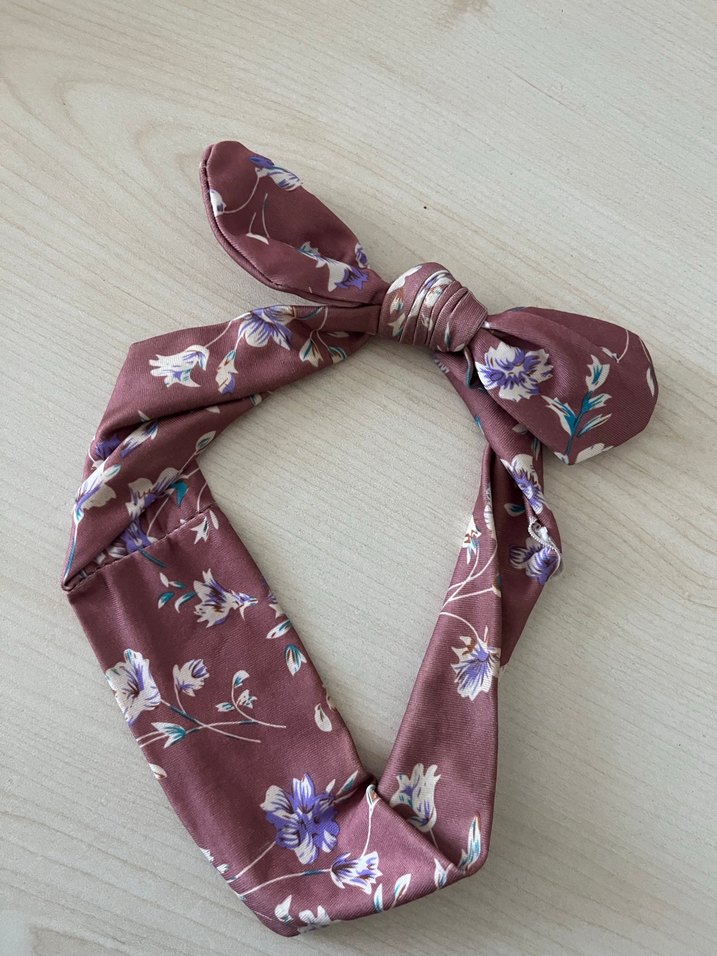 Bordo renkte, çiçek desenli ve fiyonk detaylı sentetik kumaş saç bandı, vintage bohem tarzını yansıtır.