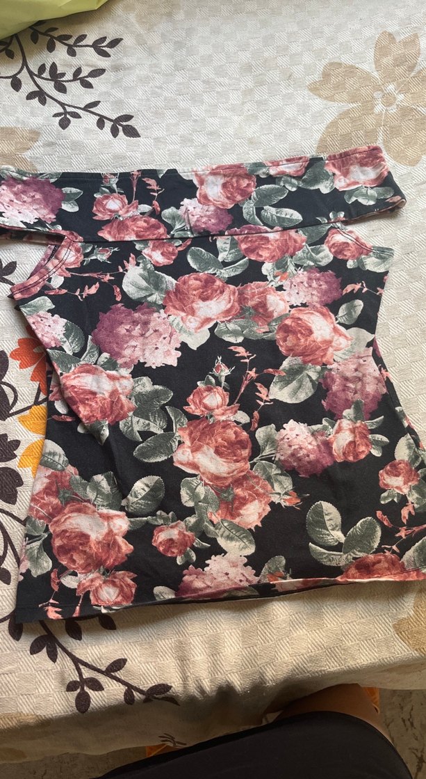 Bordo çiçek desenli, kısa kollu, kayık yaka ve volan detaylı, bohem tarzda hamile tunik.