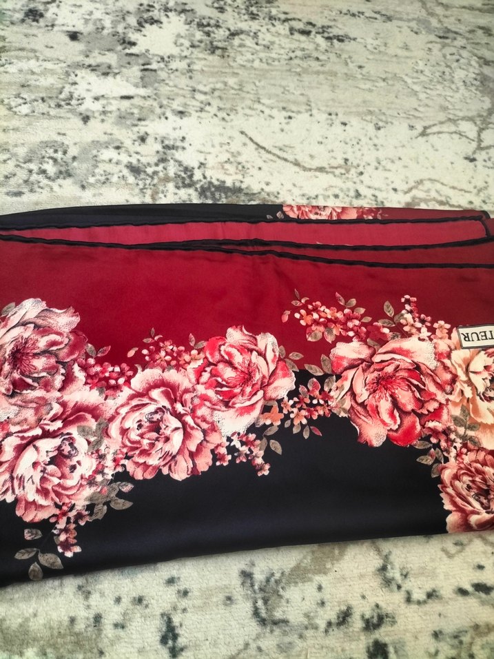 Bordo renkte, ipek görünümlü ve çiçek desenli, drapeli fular. Vintage bohem tarzına uygun. Adet fiyatı