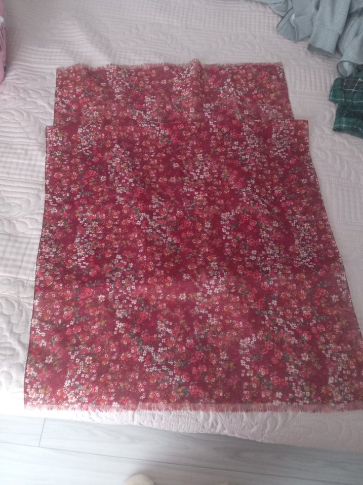 kırmızı renkli, çiçek desenli ve dökümlü tasarıma sahip kadın şalı, yumuşak sentetik kumaştan üretilmiştir.