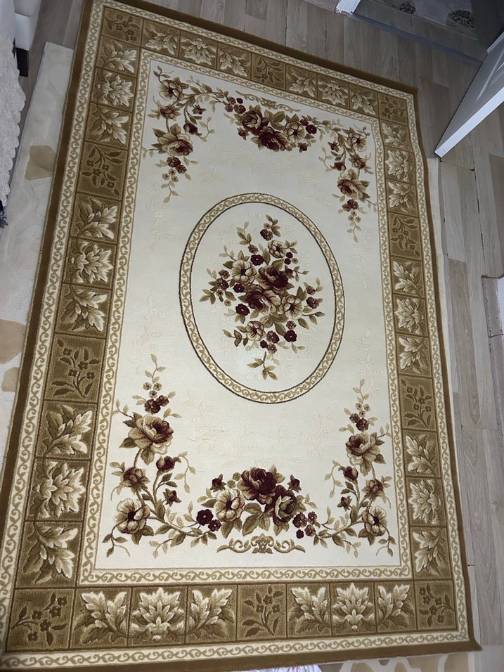 Bu klasik halı, açık zemin üzerinde bordo çiçek desenleri ve süslü bej bir çerçeveye sahiptir.