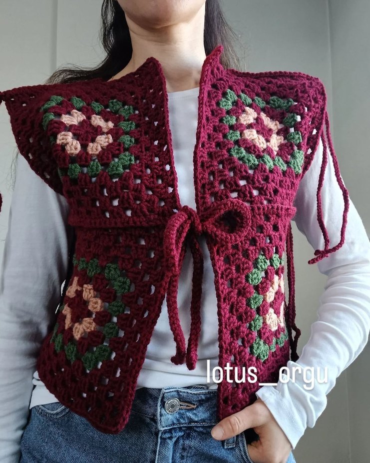 Bordo çiçek desenli örgü yelek, askısız ve kolsuz tasarıma sahiptir. Önü bağlamalı, bol kesim ve rahat bohem tarzındadır.