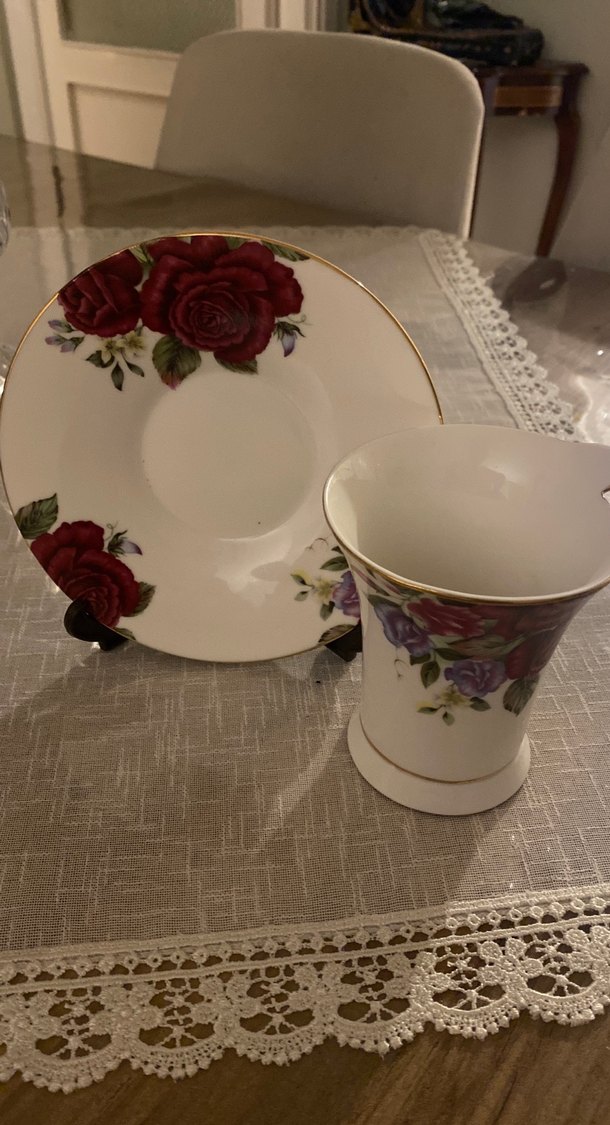 Bordo çiçek desenli ve altın detaylı porselen fincan ile tabağı, zarif çay keyifleri için uygun. ☕