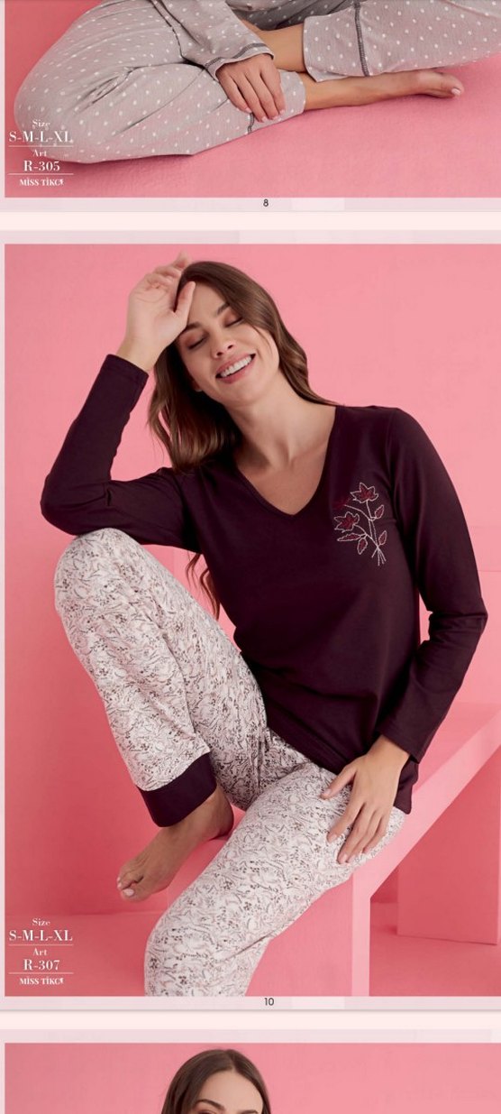 Bordo üstü çiçek işlemeli, uzun kollu ve bol kesim kadın pijama takımı. Alt kısmı açık renk çiçek desenli, rahat ve modern tarzda.