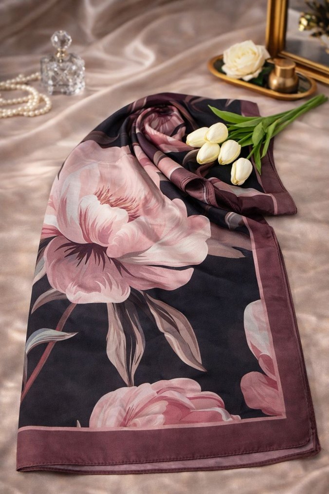 Bordo renkli, ipek dokulu ve drapeli tasarıma sahip kadın şal, büyük çiçek desenleriyle klasik ve bohem tarzı birleştirir.