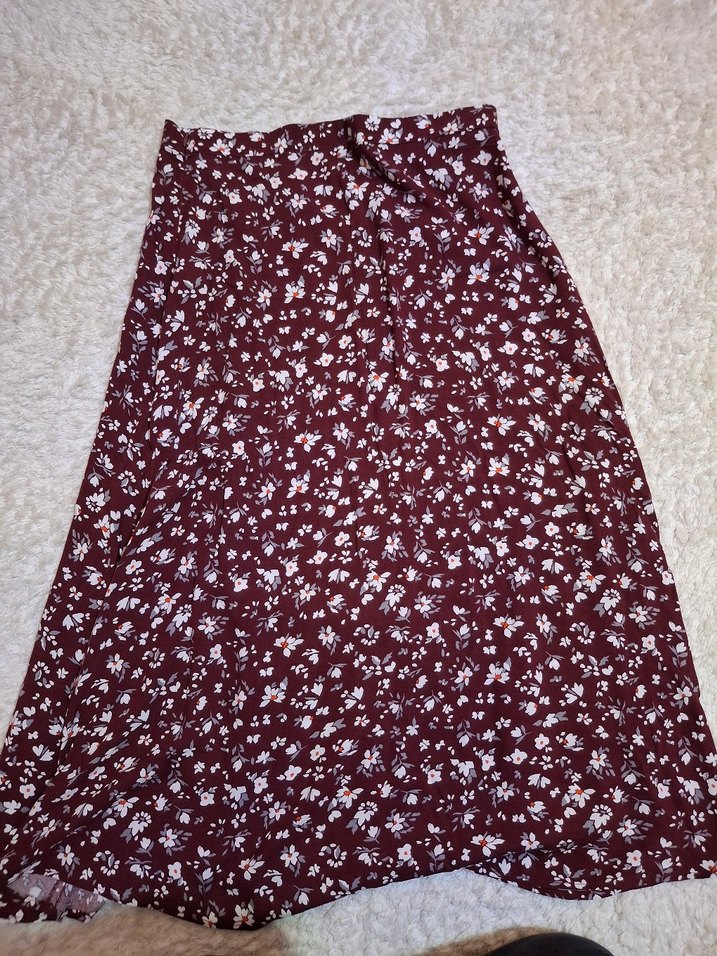 Bordo renkli, koyu çiçek desenli, sentetik kumaştan yapılmış, salaş kesim ve drapeli midi etek. Hiçç giymedim bir kusuru yok