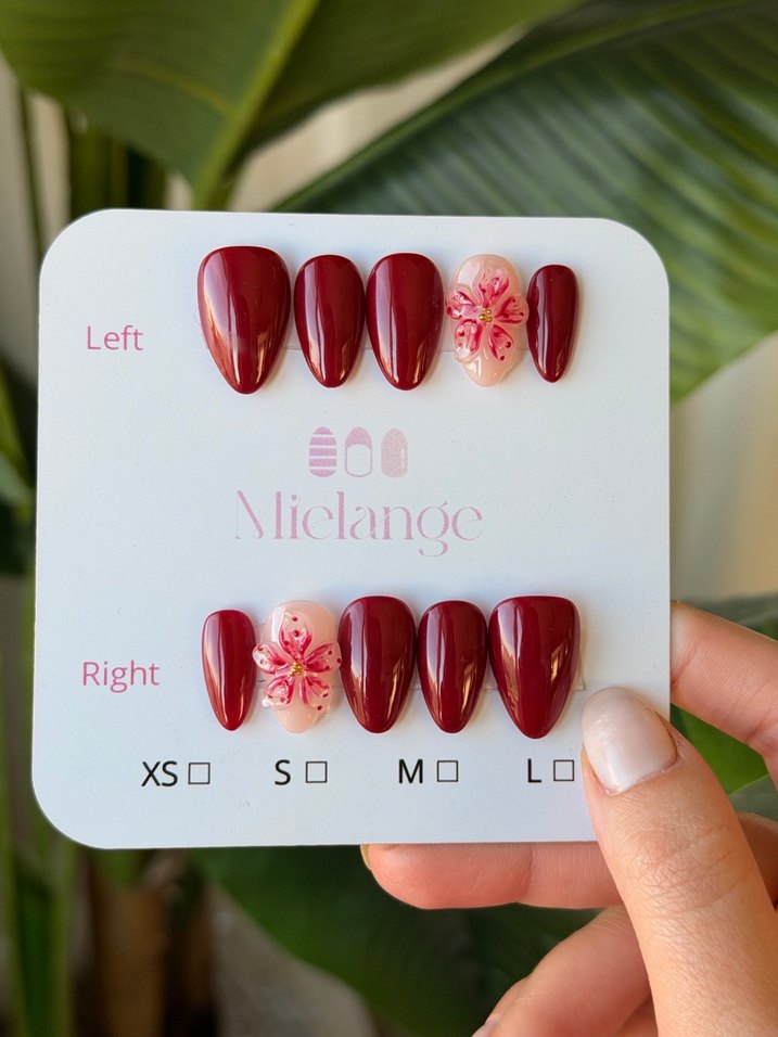 Bordo tonlarında tırnak süsleri ve çiçek desenli vurgu tırnakları içerir. Sağ ve sol el için XS'den L'ye kadar boyutlar mevcut. ✨