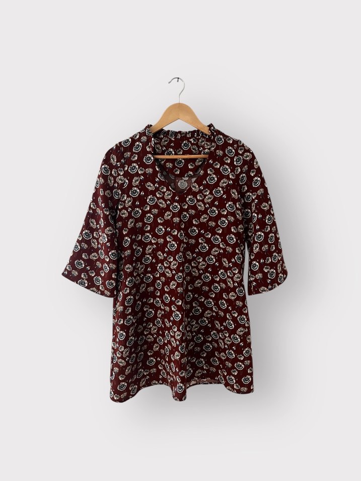 Beden: Rahat kalıp (S–M bedenlere uygun) Renk & Desen: Bordo zemin üzerine krem ve mavi tonlarında çiçek desenli Kumaş & Doku: Hafif ve dökümlü kumaş. Terletmez, gün boyu rahat kullanım sağlar. Detaylar: • Diz üstü / tunik boy • Yuvarlak yaka • 3/4 kol • Rahat, salaş kesim • Günlük kullanım için ideal • Pantolon veya tayt ile de kombinlenebilir Kalıp: Rahat ve bol kesim, vücuda yapışmaz.