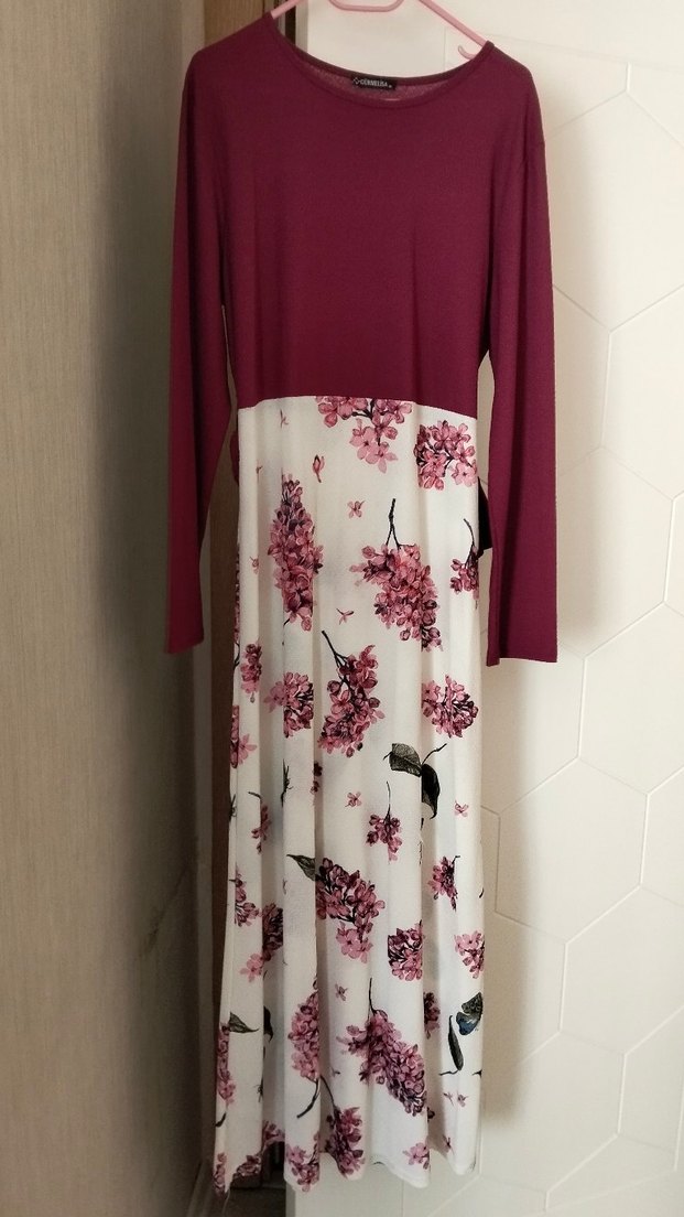 Bordo üst kısmı ve çiçek desenli etek kısmı olan, bol kesim ve uzun kollu, yüksek yakalı bohem tarzda uzun elbise. Günlük kullanıma uygundur. 38 40 beden uygundur hiç giyilmedi