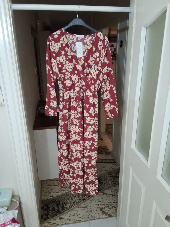 Bordo renkte, çiçek desenli, uzun kollu, V yakalı, bol kesim ve dökümlü tarzda, sentetik kumaştan yapılmış bohem elbise.