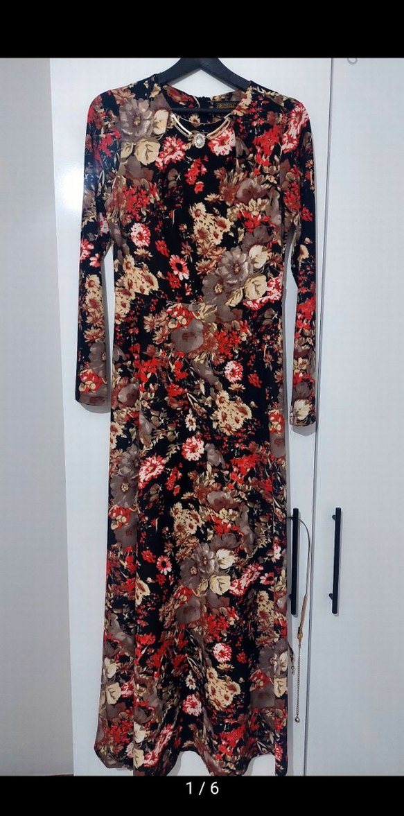 Bordo çiçek desenli, uzun kollu ve yüksek yakalı bohem tarzda, drapeli ve vücuda oturan uzun elbise.SIFIR ürün