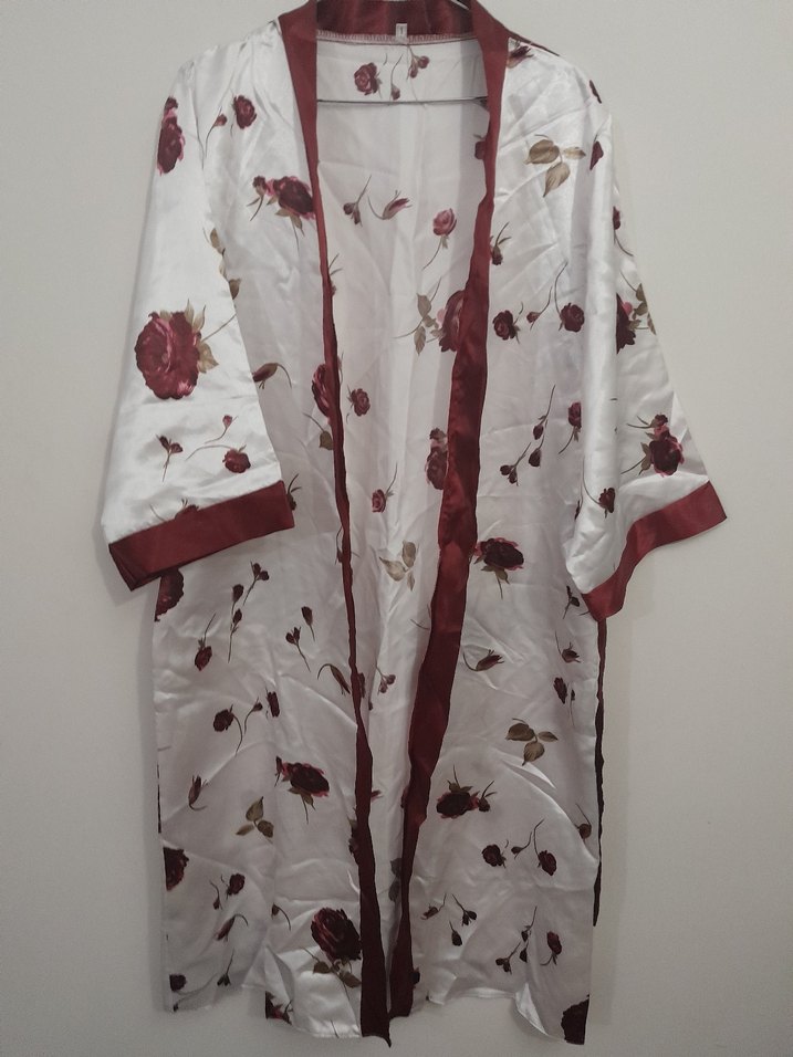 Kadınlar için uzun kollu, bol kesim uzun sabahlık. Bordo çiçek desenli ve bordo kenar detaylı, bohem tarzda şık bir parça.