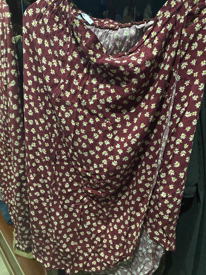 Bordo renkli, çiçek desenli eteği, dökümlü ve bol kesimli. Yumuşak sentetik kumaştan yapılmış, uzun boyda ve bohem tarzda.