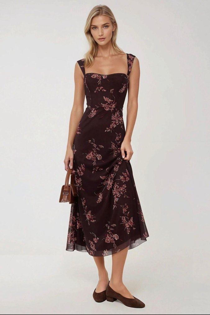 Bordo Çiçek Desenli Uzun Kadın Elbise