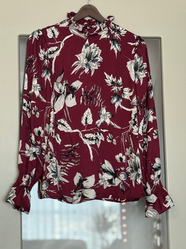 Bordo renkte, yüksek yakalı, uzun kollu ve fırfırlı detaylara sahip bol kesim çiçek desenli bohem tarzda bluz. S/M uyumludur