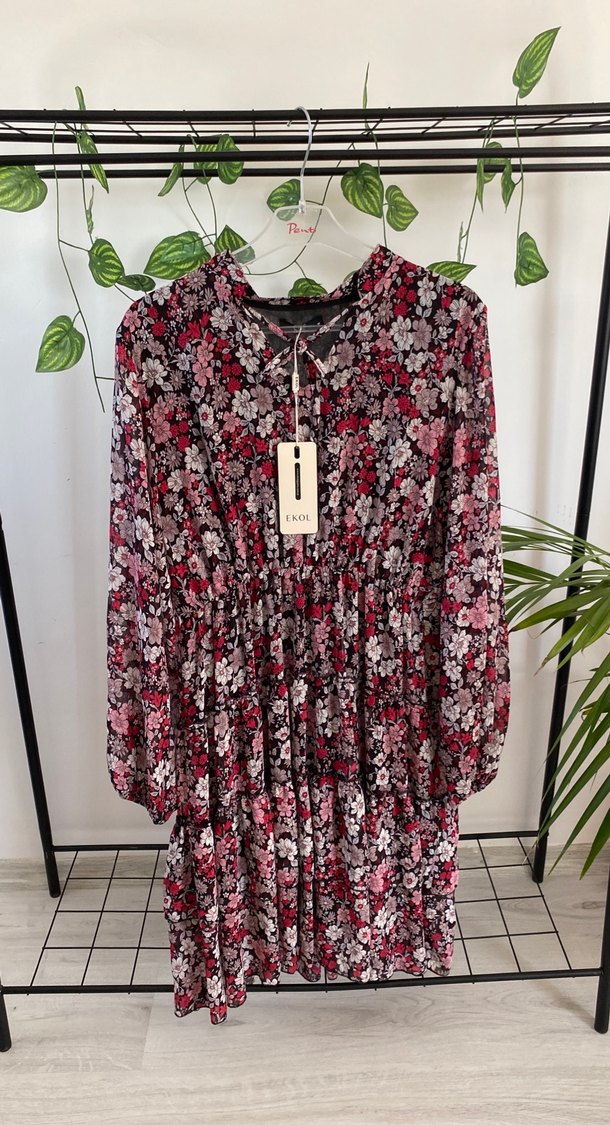 Bordo renkte, uzun kollu, yüksek yakalı, yaka baglamalı çiçek desenli bol kesim bohem elbise. Yumuşak sentetik kumaştan üretilmiştir.