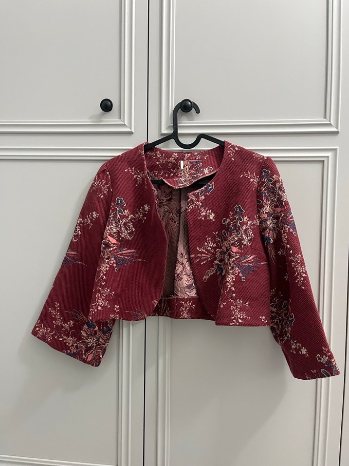 Bordo renkte, uzun kollu ve yakalı, düğmeli önden kapamalı. Bohem tarzda çiçek desenli ve standart kesim, tekstil kumaştan üretilmiştir.