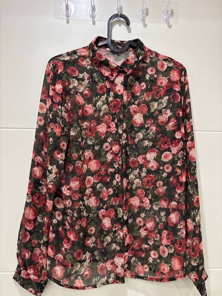 Bordo çiçek desenli kadın gömlek, yakalı, uzun kollu ve düğmeli. Sentetik kumaştan, bol kesim ve midi boyda, ofis kullanımı için uygundur.