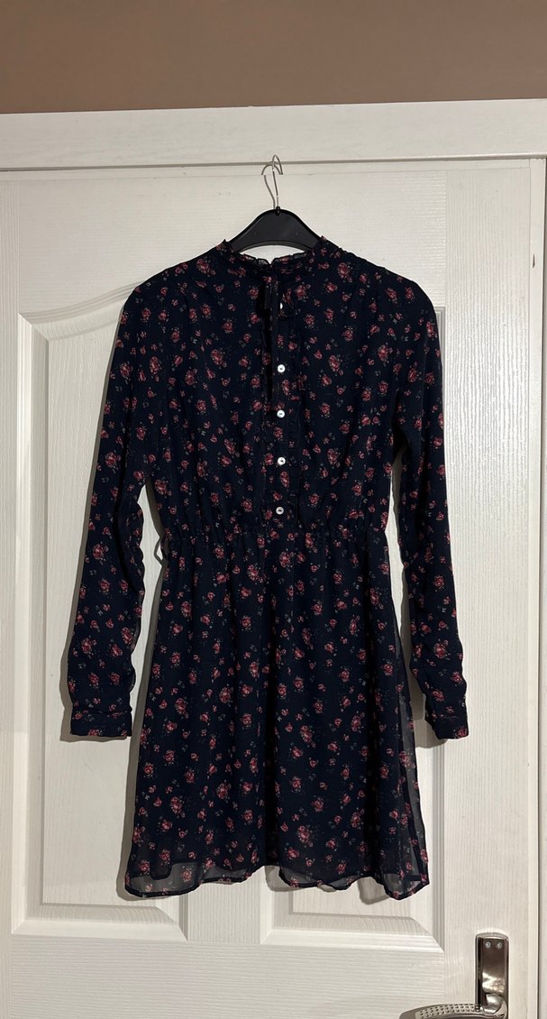 Bordo renkli, uzun kollu ve düğmeli midi elbise. Yüksek yakalı, çiçek desenli ve salaş kesim, günlük sokak stiline uygun.