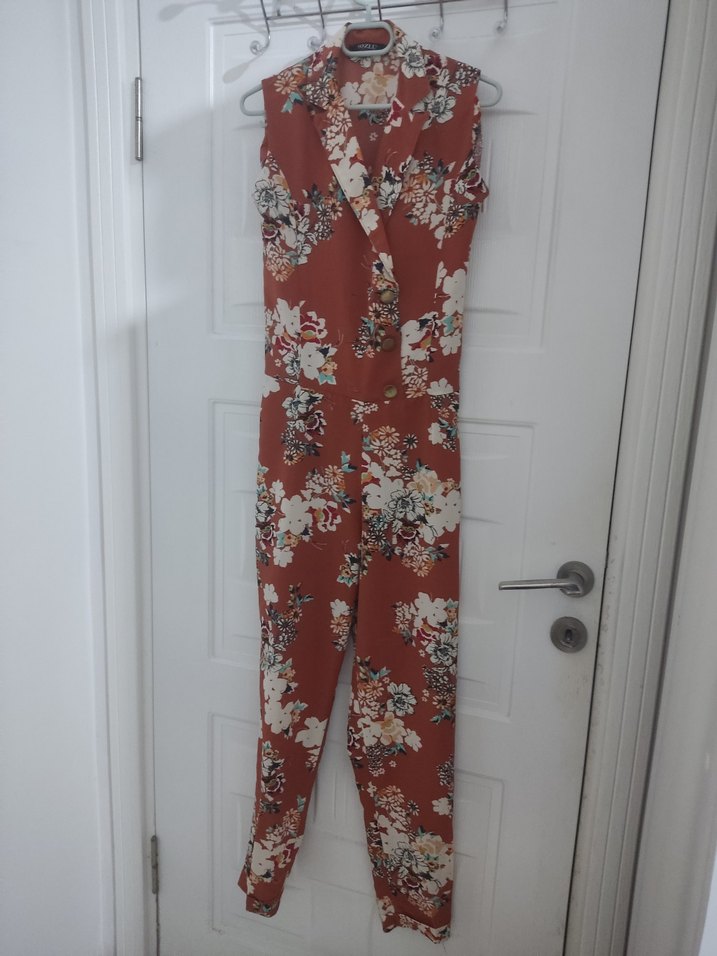 Bordo renkli, çiçek desenli, düğmeli, V yakalı, kolsuz, uzun boy ve regular fit tulum. Günlük rahat sokak tarzı için uygundur.