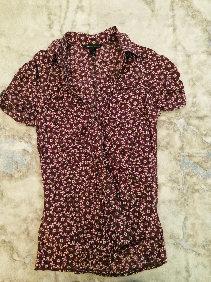 Bordo çiçek desenli, düğmeli, kısa kollu, V yaka ve normal boyda, trendi kesime sahip kadın gömleği.