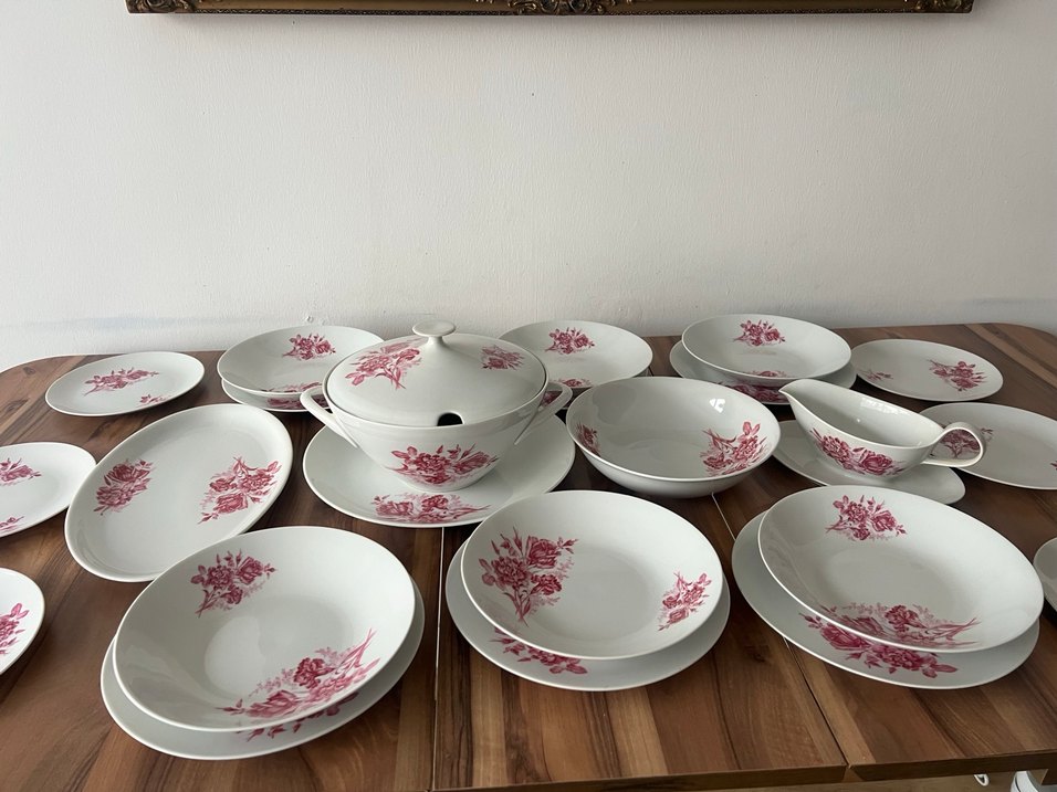 Bordo çiçek desenli tabaklar ve kapaklı servis kasesi içeren yemek takımı.