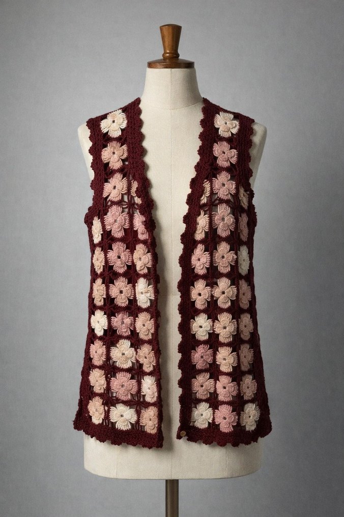 Bordo ve pembe tonlarında çiçek nakışlı, örgü, kolsuz, bol kesim bohem yelek. Günlük kullanıma uygun rahat bir modeldir.