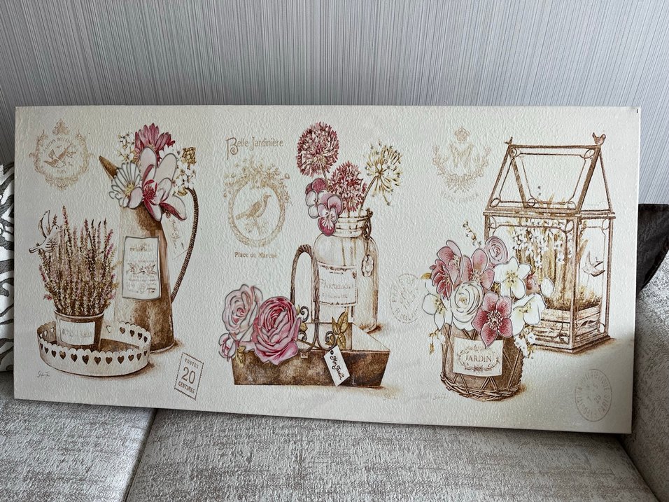 Bordo ve açık tonlarda çiçek düzenlemeleri içeren dekoratif tablo, mekâna yumuşak ve vintage bir hava katıyor.