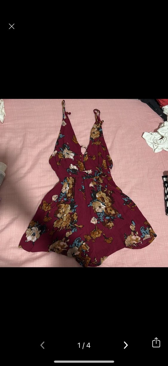Bordo renkte, çiçek desenli ve dantelli, V yakalı, askılı bohem tarzda dar kesim tulum. M beden