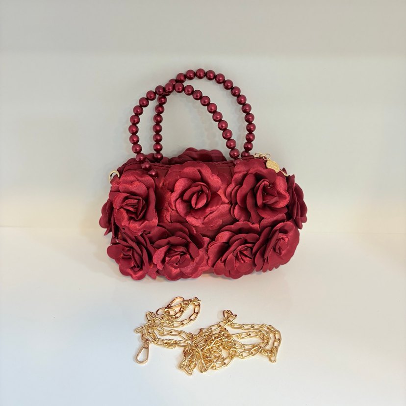 Bordo renkli kadın çantası, ipeksi kumaş üzerine çiçek detayları ve boncuklu saplara sahiptir. Çıkarılabilir altın zincir askısı ile bohem ve klasik şıklığı bir araya getirir, düğünler için uygundur.