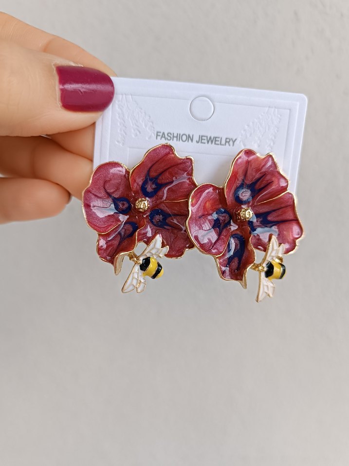 Bordo çiçek desenli, boncuk detaylı ve küçük arı süslemeli küpe, cesur Bohem Paris tarzını yansıtıyor. Günlük kullanıma uygun.