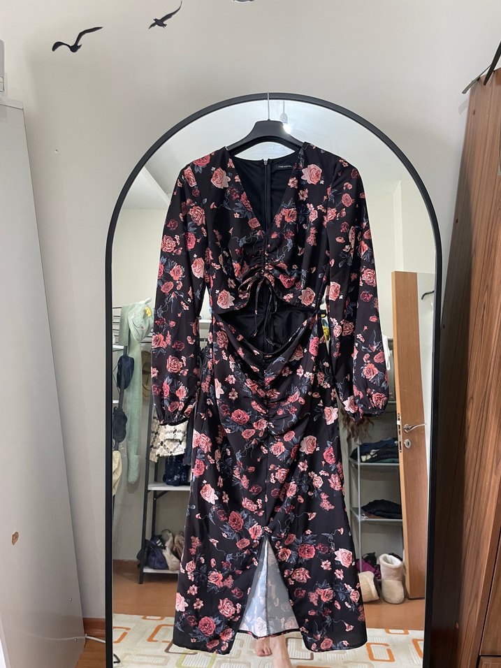 Bordo renkli, çiçek desenli uzun elbise, v yaka ve uzun kollu. Drapeli tasarımı ve dar kesimiyle günlük kullanıma uygun.marka temsili trandyoldan aldım ❗️‼️