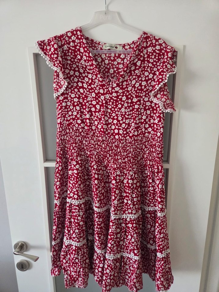 Kırmızi renkte, pamuk kumaştan, V yakalı, kısa kollu, bol kesim bohem elbise. Renkli çiçek desenli ve normal boyda, fırfırlı detaylara sahiptir. Boyu 93 cm dır.İade yoktur.