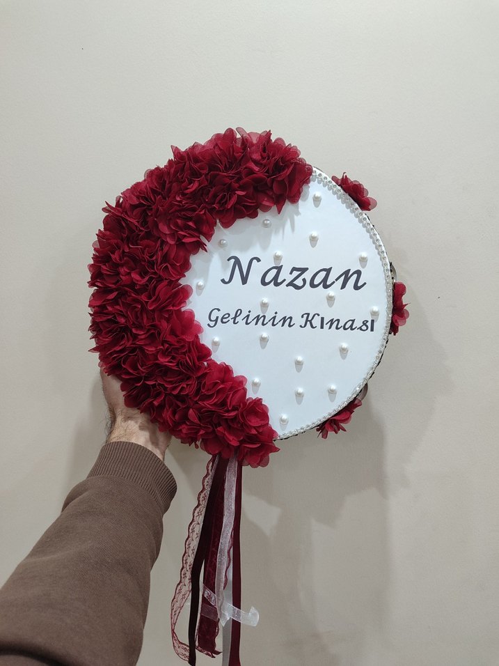 Bordo renkli, çiçek desenli broş, kurdele detaylıdır. Bohem ve mütevazı tarzda düğünler için uygundur. Üzerinde "Nazan, Gelinin Kınası" yazısı bulunur.
