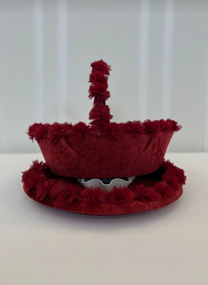 Bordo renginde çiçek detaylı sepet ve tabak seti, dekoratif bir görünüm sunar.