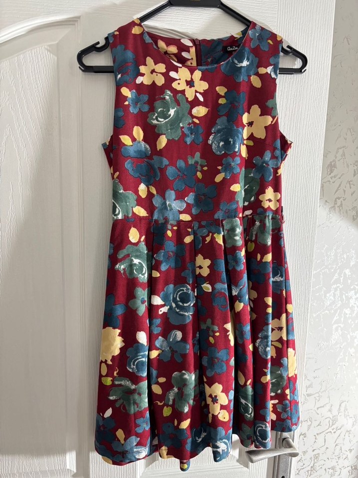Bordo renkli, çiçek desenli, pile detaylı, kolsuz ve midi boy bohem elbise