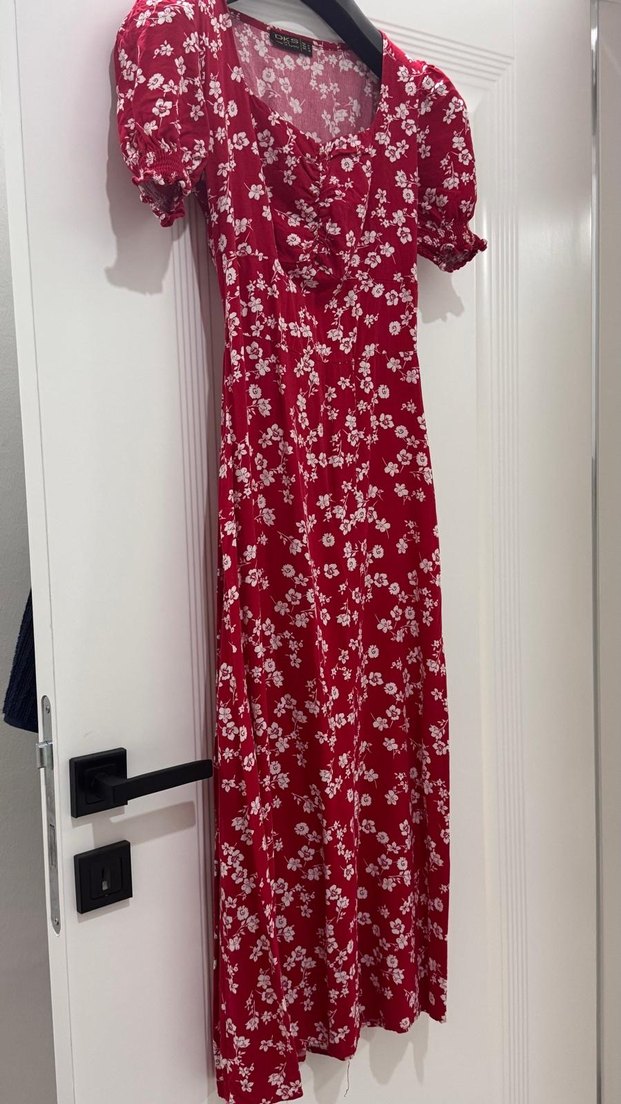 Bordo renkli, fitted kesim uzun elbise, straplez yaka ve drapeli detaylara sahip, çiçek desenli bohem tarzda.