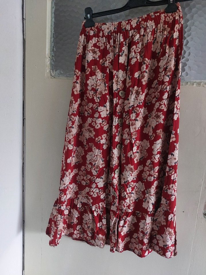 Bordo tabanlı, çiçek desenli uzun ve bol kesim etek. Bohem tarzıyla günlük kullanıma uygundur.