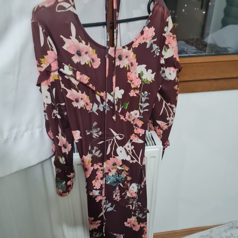 Bordo renkli, çiçek desenli uzun ve vücuda oturan bohem tarzda kadın elbise. Drapeli halter yaka ve askılı kolları vardır, günlük kullanıma uygundur. 40 beden hiç giyilmedi.