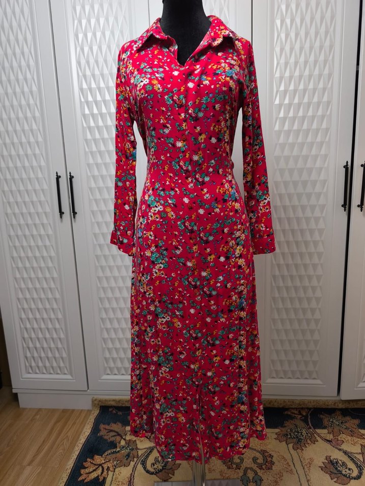 Bordo renkte, renkli çiçek desenli, uzun kollu, V yaka ve düğmeli, yumuşak sentetik kumaştan regular fit uzun elbise.