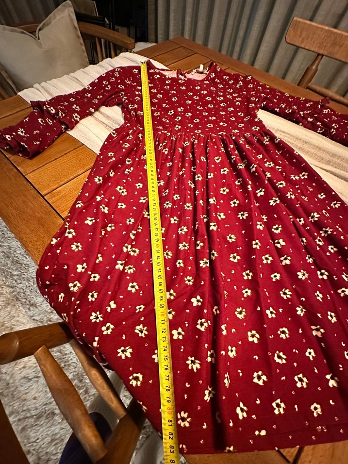 Bordo renk, uzun kollu elbise. Çiçekli desenli, bol kesim ve fırfır detaylı, yumuşak esnek bir kumaşı var. Bir defa kullanıldı.