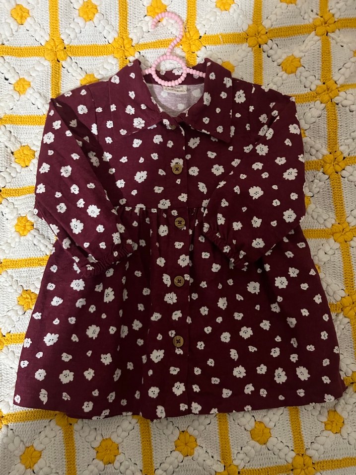 Bordo renkli, pamuklu kumaştan uzun kollu, yakalı ve düğmeli kız elbisesi. Renkli baskılı desenlere sahip, bol kesim bohem tarzda.