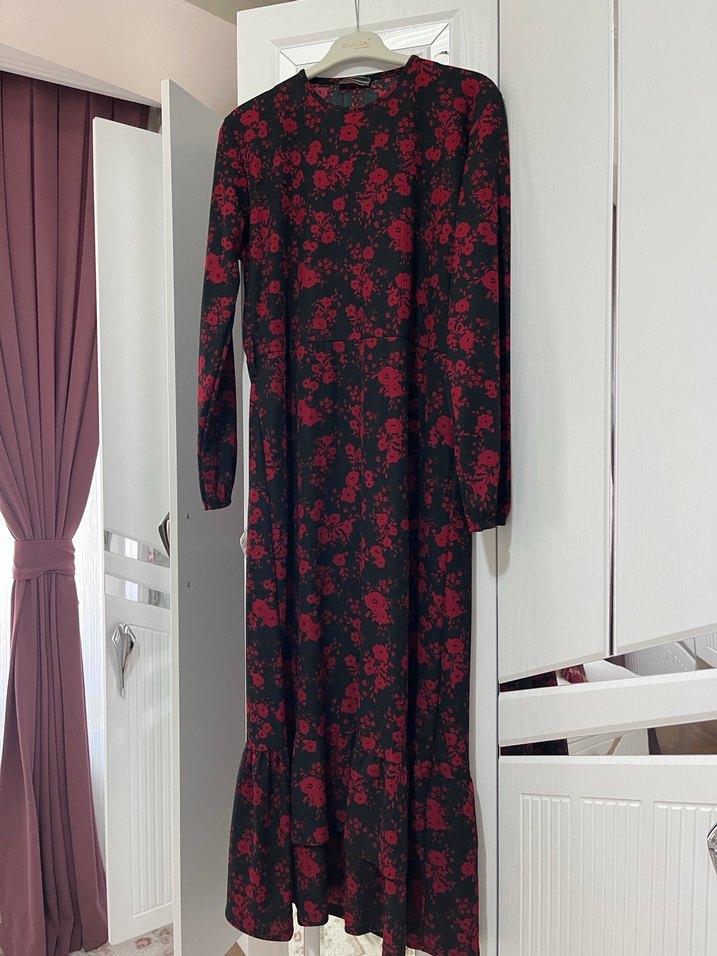 Bordo uzun elbise, bol kesim, uzun kollu ve yüksek yakalıdır. Yumuşak sentetik kumaştan, koyu çiçekli batik desenli ve fırfırlı detaylara sahiptir.