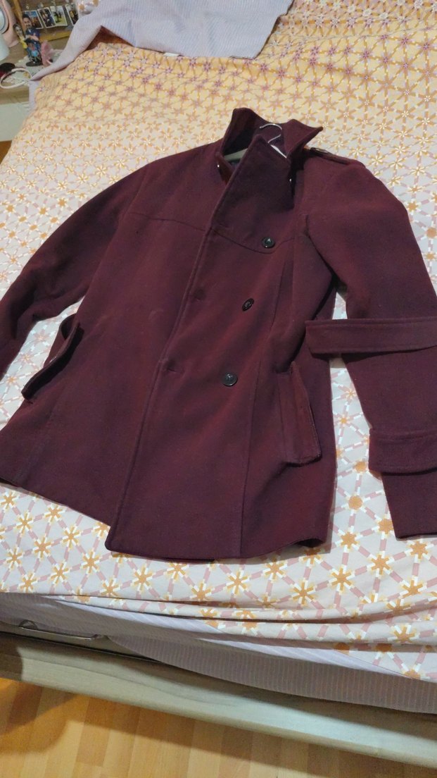 Bordo renkte, çift düğmeli ve yan cepli kaban. Yapılı yaka ve uzun kolludur, sıcak tutar.
